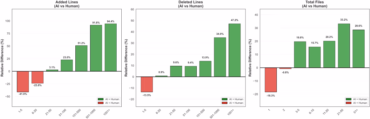 具体的には、AI支援によるコミットは、数行の修正といった小規模な作業よりも、多くのファイルにまたがる変更や、数百行単位のコード追加において頻繁に利用されています。また、コードの「削除」においてもAIの活動量は多く、コードベースに対する変更が多くなる傾向が読み取れます。これは、エージェントが既存のコードを大胆に書き換えるリファクタリングや、大規模な機能実装に用いられていることを示唆しています。