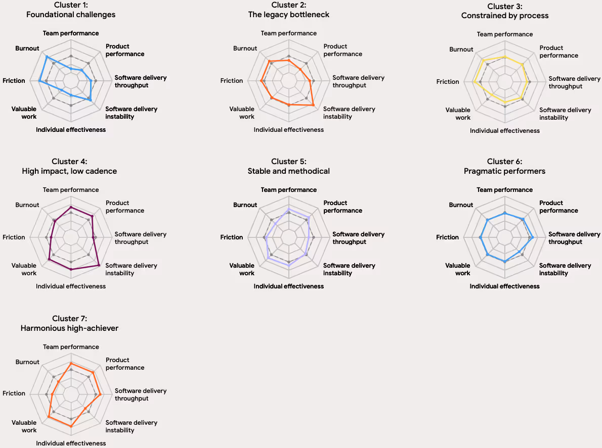 - Cluster 7: Harmonious high-achiever(調和の取れたハイアチーバー): 安定した環境で、燃え尽きることなく持続的に高品質な成果を出す理想的なチーム。(全体の20%)