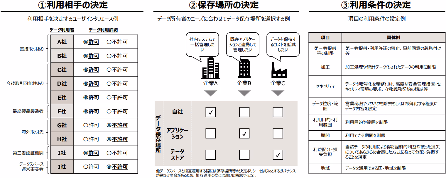 データ提供者は、利用相手、保存場所、利用条件(加工の制限や開示範囲など)を自己決定できる仕組みが必要です。また、参加者間で営業秘密を守りつつ安全にデータを流通させるために、データスペースの運営事業者が主体的に関与する「モデル規約」を活用し、ルールに基づいた公平な連携環境を構築することが推奨されています。